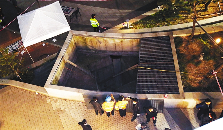 10月17日,在韩国京畿道城南市,救援人员在地铁换风口坍塌事故现场检查。 据韩联社17日报道,韩国京畿道城南市当天发生一起地铁换风口坍塌事故,20余人坠入约10余米深的地下,目前可能已造成14人死亡,11人重伤。 新华社/法新