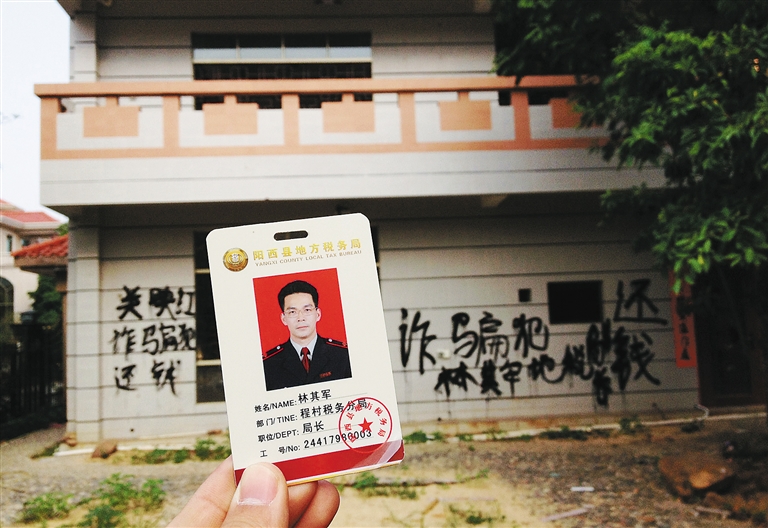 林其军的住所,是阳江市阳东县阳东花园一栋占地面积500平方米的4层别墅。如今,这里人去楼空,门窗、吊灯、玻璃已被受害人泄愤砸烂。一块写着“还我债权人血汗钱欠债还钱”的白色横幅挂在4楼阳台,“林其军地税局长伙同关映红、林其燕诈骗我们血汗钱”的黑体字在墙上、柱子上、玻璃上随处可见。