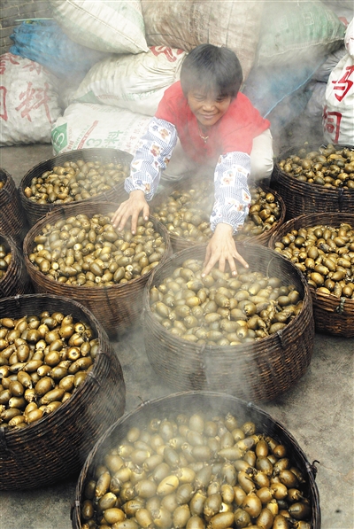 在湖南,“早期的湘潭槟榔是用石灰加糖熬成浆,涂在槟榔外表制成,被称作‘石灰槟榔’,后改为用酒、糖精浸泡后,点上桂子油、薄荷油之类的香料,称为‘改良槟榔’。”在湖南湘潭从事槟榔业的陈坚强介绍,到上世纪80年代以前,湘潭槟榔的销售,就是一把菜刀、一个盆子、一块砧板,蜷缩于街头巷尾的小商贩们维持生计,全市制作经营的不上百户。