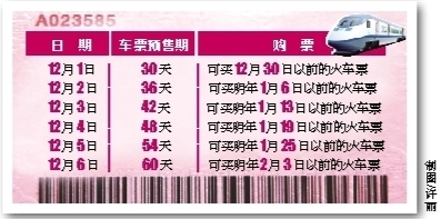 另悉,车站窗口、代售点窗口、自动售票机等售票方式的预售期分别为:12月1日为28天,12月2日为34天,12月3日为40天,12月4日为46天,12月5日为52天,12月6日为58天,较互联网、电话订票预售期相应错后两天。