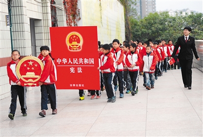 12月2日,重庆云阳教师进修学院附属小学的学生们列队参加“送法进校园”主题活动。当日,重庆市云阳县人民法院举办“送法进校园”主题活动,法官们走进云阳教师进修学院附属小学,讲解国徽、国歌及宪法的由来和所代表的含义,并组织学生们进行树立宪法信仰宣誓活动,以此迎接首个“国家宪法日”的到来。 新华社发
