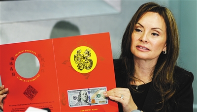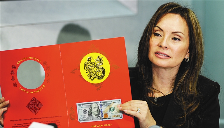 12月2日,在美国首都华盛顿,美国财政部官员罗茜·里奥斯展示农历羊年限量版100美元“吉利钱”。美国财政部造币和印钞局当日宣布,为庆祝即将到来的中国农历羊年,将自3日起发行2015年生肖羊主题限量版“吉利钱”1美元和100美元纸币。 新华社记者 鲍丹丹 摄