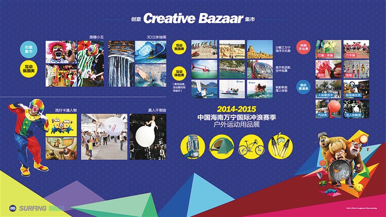 3.20项创意集市:包括海洋文化沙雕展、直升机体验、3D立体地画、帆船帆板、摩托艇、沙滩车、冲浪培训、真人不倒翁、中华剪纸、泥人面塑、竹编、人体悬浮行为艺术、活人体雕塑、极限单车秀、沙滩宝贝、滑稽小丑气球秀、小黄人、光头强和熊大熊二、竹竿舞。