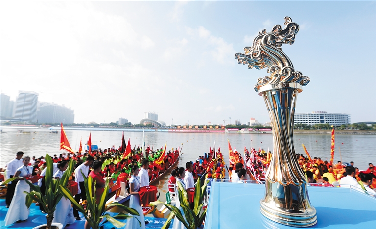 龙丁敏解释,赛龙舟是我国最重要的民俗活动之一,在南方非常流行,具有历史悠久的文化传统。群众通过赛龙舟、祭祀等,祈求农业丰收、风调雨顺、去邪祟、攘灾异、事事如意,“图个吉利”,表达内心良好的愿望;中华龙舟大赛是我国最高级别的龙舟赛事之一,陵水举办此项赛事,让群众充分参与进去,满足他们对赛事和文化的需求;同时,通过举办中华龙舟大赛,提升陵水人民的龙舟竞技水平,让他们走出去,以赛交友、扩大眼界等。