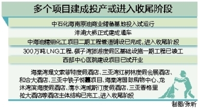 截至目前,海棠湾国际购物中心项目、海口观澜湖项目、300万吨LNG站线项目、海南原油商业储备基地项目等逾百个项目已完成年度投资计划,逾140个项目处于主体施工阶段等。