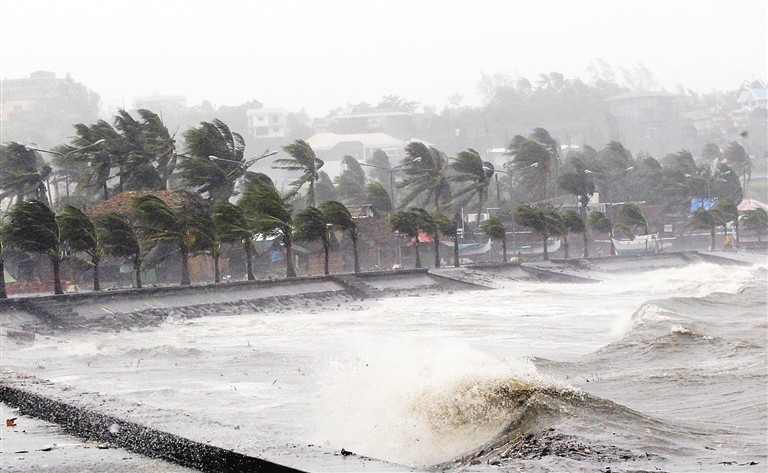 12月7日,在菲律宾阿尔拜省的黎牙实比市,台风卷着巨浪拍打海防线。 强台风“黑格比”当日登陆菲律宾中部地区。为避免去年超强台风“海燕”登陆造成的惨重教训重演,菲律宾政府已将超过60万民众转移安置到更安全的场所。 新华社/路透
