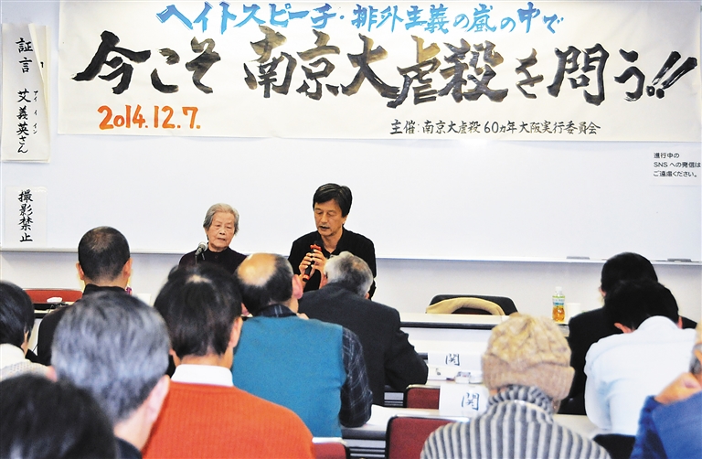 12月7日,应日方邀请,中国南京大屠杀幸存者、86岁的艾义英老人(后排左)7日在大阪参加证言集会,讲述自己在南京大屠杀中的亲身经历,提醒人们勿忘历史,珍惜和平。