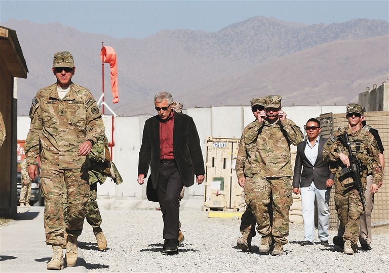 12月7日,在阿富汗东部拉格曼省的美军基地,美国国防部长哈格尔(右)抵达基地。 美国国防部长哈格尔6日突访阿富汗。这是哈格尔以国防部长身份最后一次到访阿富汗。新华社/法新