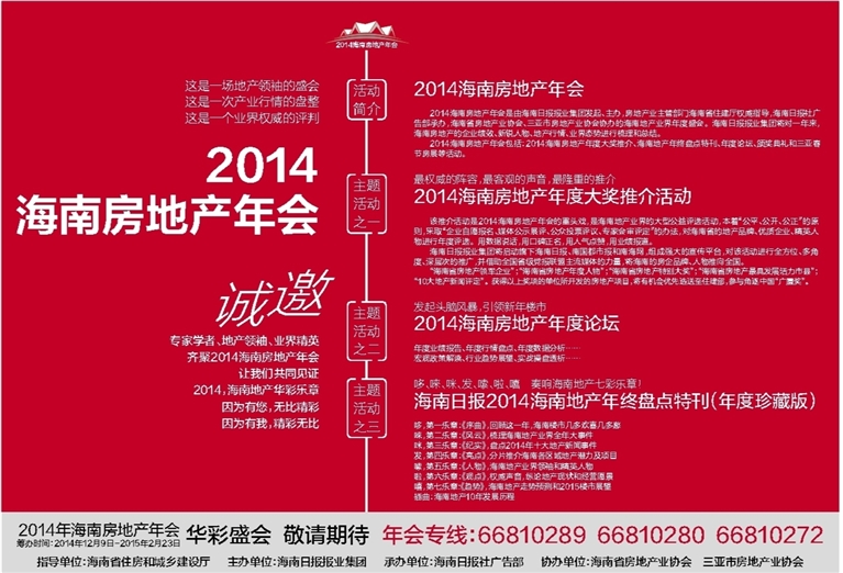 2014海南房地产年会包括:2014海南房地产年度大奖推介、海南地产年终盘点特刊、年度论坛、颁奖典礼和三亚春节房展等活动。