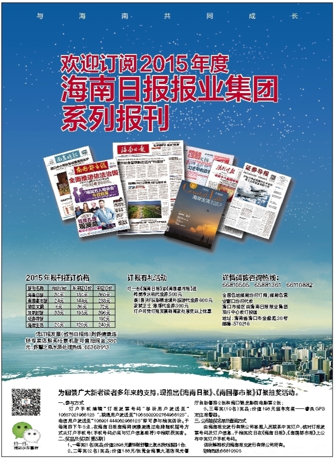 为回馈广大新老读者多年来的支持,现推出《海南日报》、《南国都市报》订报抽奖活动。