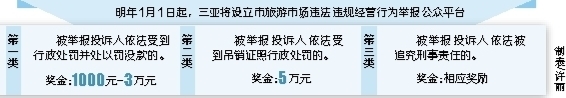 为更好地提升旅游市场管理水平,三亚决定从明年元旦开始,在全国率先试水全民参与旅游市场整治,以物质鼓励的方式,引导百姓举报旅游市场违法违规经营行为,畅通问题调查处理通道,形成对旅游经营者强有力的监督机制,压缩旅游市场“顽疾”、“难点”问题的生存空间。