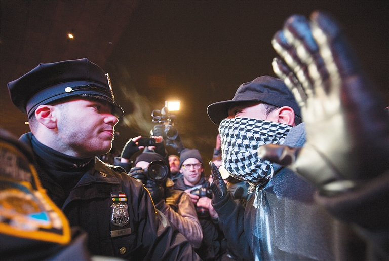 12月8日,在美国纽约布鲁克林,警察和一名示威者对峙。 当日,示威者们聚集在布鲁克林巴克莱中心前,抗议在弗格森镇枪杀黑人青年迈克尔·布朗的白人警官达伦·威尔逊和在纽约扼杀非洲裔男子埃里克·加纳的白人警察丹尼尔·潘塔莱奥被免于起诉。 新华社/路透