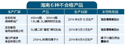 定安定城涓涓榨油厂的不合格产品为2014年8月13日生产的4种规格花生油。450ml/瓶的阿财花生油生产30瓶,销售6瓶(其中4瓶被抽样单位购买),召回24瓶。900ml/瓶的阿财花生油生产14瓶,销售7瓶(其中4瓶被抽样单位购买),召回7瓶。1.6L/桶的阿财花生油生产6桶,销售6桶(其中4桶被抽样单位购买)。3L/桶的阿财花生油生产5桶,销售4桶(其中4桶被抽样单位购买),召回1桶。