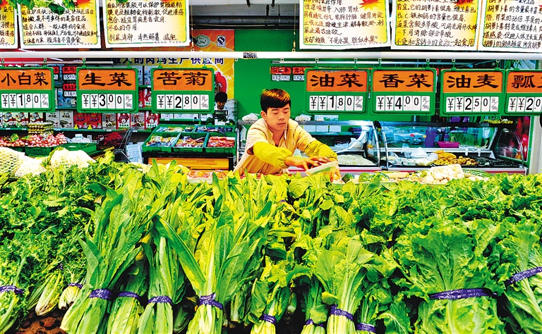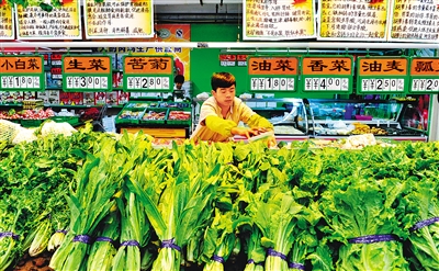 工作人员在河北省沧州市新华区一超市内摆放蔬菜(12月9日摄)。 12月10日,国家统计局发布数据显示,2014年11月份全国居民消费价格总水平同比上涨1.4%。 新华社记者 牟宇 摄