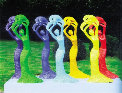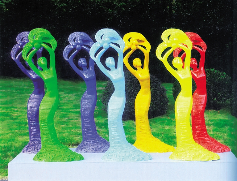 7位少女手举椰果仰望碧空,姿态如同椰树一般婀娜挺拔。这组色彩鲜艳的景观雕塑由省雕塑艺术学会理事颜红梅创作,为佳作林立的“全国景观雕塑邀请展”平添一抹春色。