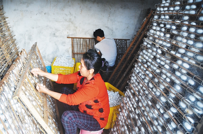 青山脚下,成片桑田连绵起伏,郁郁葱葱。一条长龙般的观光栈道穿过桑田,与远处的农舍、观景亭、拱桥、炊烟相映成趣。在湾岭镇岭脚村村口的一间蚕房里,村民王巧霞熟练地将蚕架上的蚕茧,一个个捡出放入竹筐中。王巧霞是岭脚村首批种桑养蚕尝到“甜头”的农户,自2007年开始养蚕,积累了丰富的养蚕经验,她家每年桑蚕收入在5万至6万元左右。