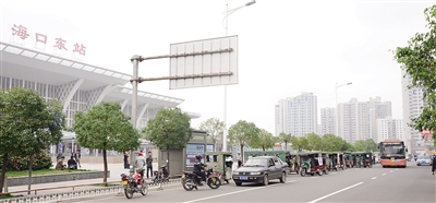 本报海口12月10日讯(记者李关平)“去海师吗?15元!”“去秀英码头,30元!”……9日上午10时许,东环高铁海口东站,旅客鱼贯而出,车站广场前路段如马路市场,机动三轮车(以下简称“黑三轮”)蜂拥而至拉客,导致公交车都无法靠边停车。