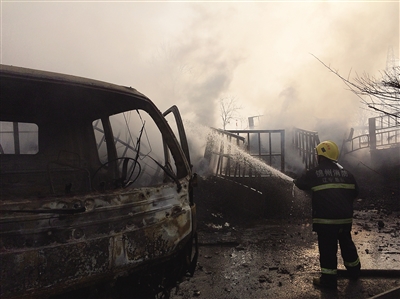 2014年12月10日,消防人员在事故现场灭火。当日,辽宁锦阜高速锦州至阜新方向57公里处发生20多辆车辆连环相撞事故,其中一辆载有鞭炮的大货车发生火灾,并引燃其它追尾车辆。锦州市消防支队接到报警后,及时赶赴现场实施救援,事故未造成人员伤亡。新华社发