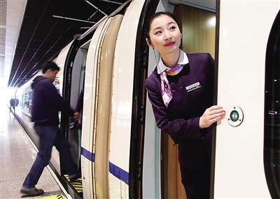 12月10日,列车途经杭州东站时,乘务员观察旅客上车情况。 当日,首趟上海至广州的高铁G85次列车正式上线运行。同日,全国铁路实施新的列车运行图,上海客运段共担当高铁动车组列车105对,成为长三角地区担当高铁列车最多的客运段。新华社发