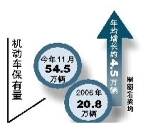 随着经济的快速增长、人均收入水平和人口的迅速增加,海口市机动车保有量大幅增长。“十一五”以来,机动车保有量从2006年的20.8万辆增加到2014年11月的54.5万辆,年均增长约4.5万辆,其中汽车约44万辆。按照常住人口来算,平均约5人即拥有汽车一辆,而全国平均水平为每百户家庭拥有汽车21.5辆,即为每5户拥有一辆汽车。仅从汽车保有量而言,海口已远远超过全国平均水平。按照国际通行的汽车社会最低门槛——每百户家庭20辆车的标准,海口已进入“汽车社会”。