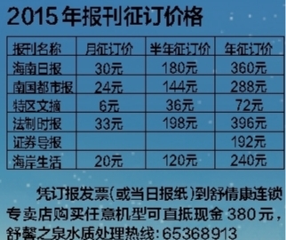 订一份《海南日报》或《南国都市报》送格美净水机代金券500元泰(国)好玩新概念境外旅游代金券600元 家装卫士·潮盾代金券300元 订户可凭订报发票到商家处享受以上优惠