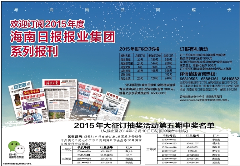 领奖说明:获奖订户凭有效订单、发票及身份证件于开奖之日起七个工作日内到海口市金盘路30号海南日报发行中心领取。