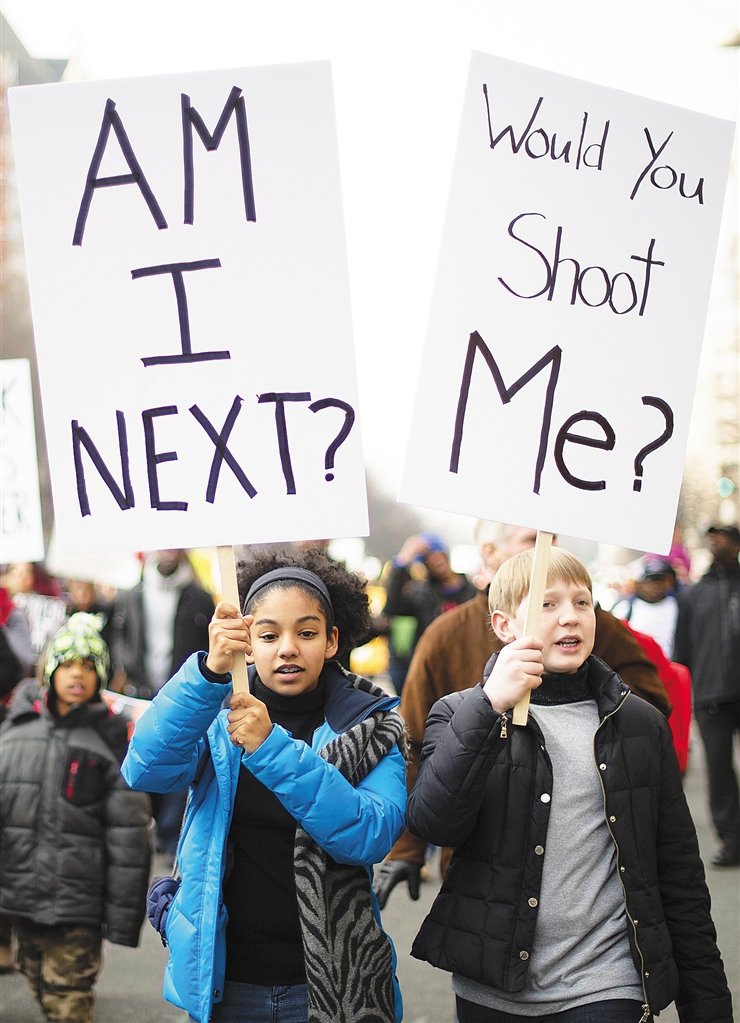 在华盛顿,弗格森和纽约种族事件受害者迈克尔·布朗以及埃里克·加纳的亲属参加了当天的抗议活动。近万名白人以及非洲、亚洲和拉丁美洲等少数族裔民众举着“我不能呼吸”、“生命意义重大”、“警察在撒谎”、“摒除种族主义”、“举手投降,不要开枪”等标语并大声呼喊口号,在白宫和国会大厦之间的宾夕法尼亚大街上游行。