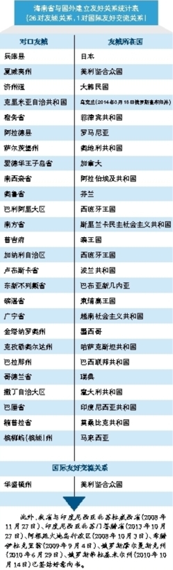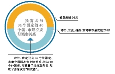 1990年,我省与日本兵库县、海口市与澳大利亚达尔文市分别正式结好。此后20余年间,我省的国际友好省、市数量不断增加。目前,我省共与34个国家的46个省、市建立友好城市关系,其中省级友城26对,海口、三亚、儋州、琼海等市县友城20对。此外,我省还与35个外国省、市建立国际友好交流关系,并与10个外国省、市签署了结好意向书,形成了多层次的“朋友圈”。