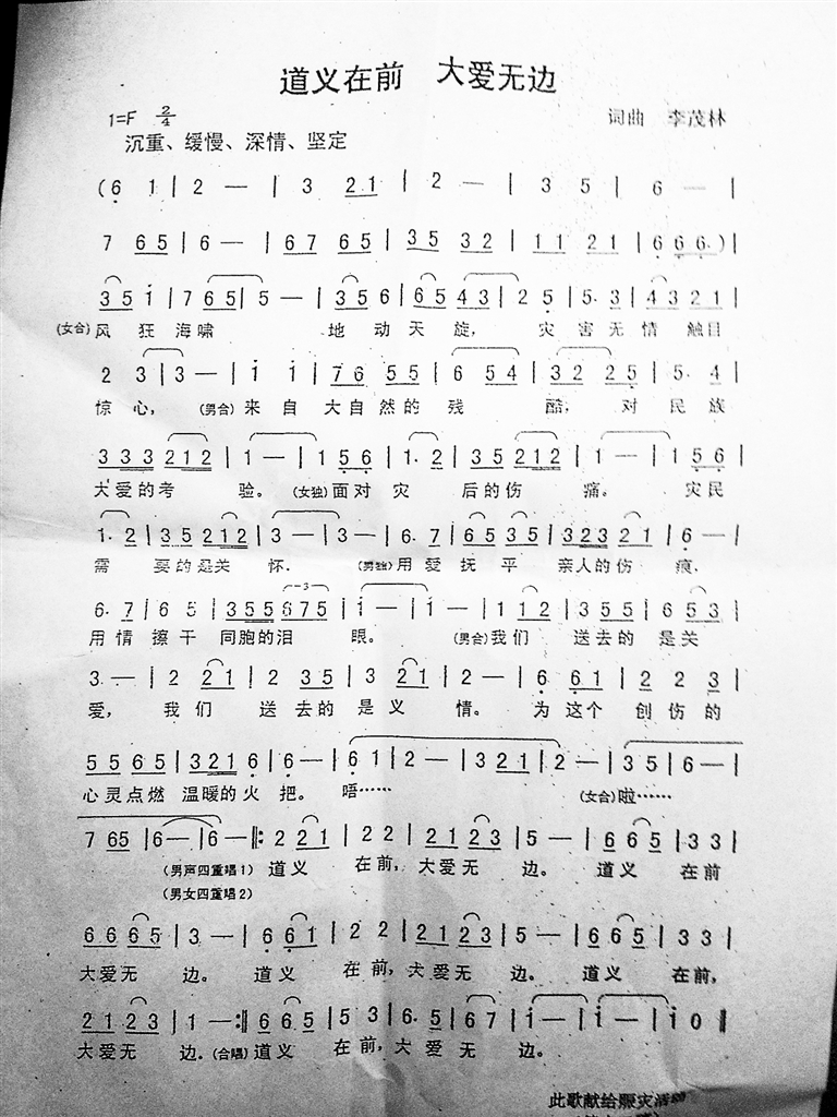 今年7月,超强台风“威马逊”给海南带来沉重打击。面对家乡的满目疮痍,李茂林含泪写下赈灾歌曲《道义在前 大爱无边》,其中“用爱抚平亲人的伤痕,用情擦干同胞的泪眼”等词句直击人心,“来自大自然的残酷,是对民族大爱的考验”更激励人们众志成城,奋勇向前。