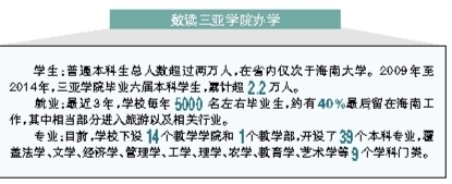 这是一个中国民办高等教育跨越式发展的生动例本:2005年秋季招收首届本科新生,三年后2008年秋季招生后突破万人规模。如今,三亚学院普通本科生总人数超过两万人,在海南省内仅次于211工程的海南大学。2009年至2014年,三亚学院毕业六届本科学生,累计超2.2万人。最近三年,学校每年5000名左右毕业生,约有40%最后留在海南工作,其中相当部分进入旅游以及相关行业。