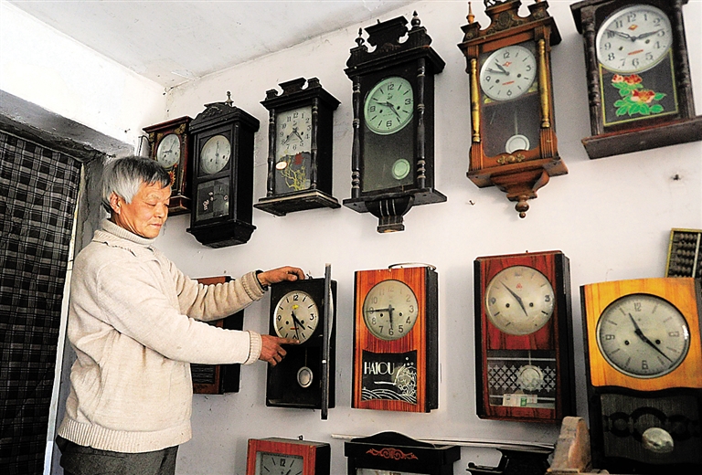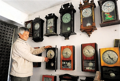 12月16日,王玉堂在整理自己的钟表藏品。 今年60多岁的王玉堂是河北省霸州市城二街的居民,几十年来他把机械钟表当成自己爱不释手的“玩具”,将自己从各地收集回来的各式各样的钟表进行维修并收藏。近日,他在自家住所里设置了一个“钟表陈列室”,摆放有数百件钟表,其中年代最久远的距今已有100多年的历史。