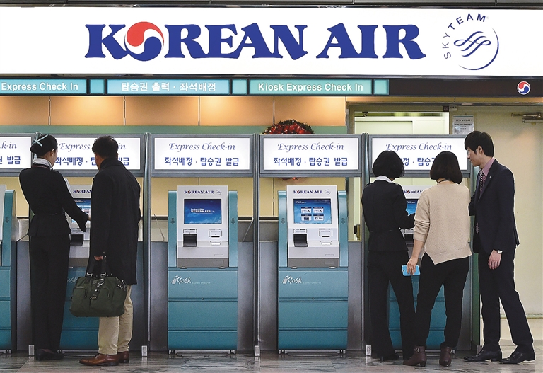 12月16日,在韩国首都首尔,大韩航空的乘客在机场办理登机手续。 大韩航空表示,由于前副社长赵显娥造成的“坚果返航”事件,该公司可能面临高达200万美元的罚款。赵显娥5日乘坐从美国纽约飞往韩国仁川的大韩航空班机时,发现空乘人员给她提供的坚果没有按规定放在盘子里,而是装在袋子里。她一怒之下要求机长将已经驶向跑道的飞机掉头开回登机口,并勒令乘务长下机,导致航班延误。由一包坚果引发的返航也被媒体戏称为“坚果返航”事件。新华社/法新