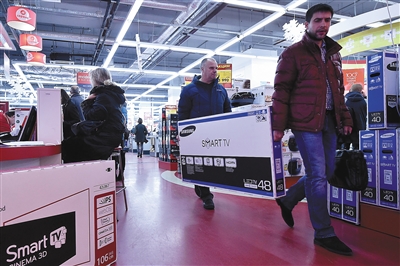 12月15日,在俄罗斯首都莫斯科市中心的一家电器商场,顾客购买平板电视机。卢布的持续贬值引发消费者对物价上涨的担心,俄罗斯市场出现抢购电子产品、家具和汽车等商品的购物潮。新华社/法新