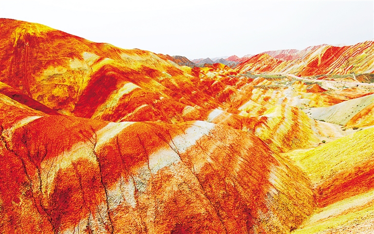 张掖的丹霞地貌,如用文字来表达,仅有两个字“震撼”:气势磅礴、造型奇特、色彩斑斓,大自然的鬼斧神工,令人叹为观止。她不仅具有一般丹霞的奇、险,而且更美的在于色。在方圆10多平方公里的范围内,随处可见有红、黄、橙、绿、白、青灰、灰黑、灰白等多种色彩,把无数沟壑、山丘装点得绚丽多姿,宛如童话世界。