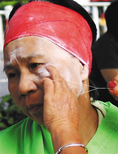 “以前绞脸的人多,师傅也多,现在越来越少啦!”吴姐说,在以前,海南很多地方的女子都有春节前绞脸修眉的习惯,以前没有美容院,老一辈人流行用这种土法绞脸美容,有的每隔一个多月就绞脸一次,已经养成了习惯。当然,现在人绞脸多是为了洁肤美容,已跟婚嫁无关。目前,整个泰龙城估计也就八九个绞脸师傅,有些从业者年纪大了便不做的,还有一些觉得挣钱少便转行了,“年轻人不想学这一手艺,慢慢的这项手艺就快失传了”。