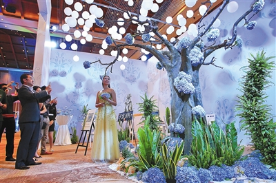 12月15日,“2014三亚目的地婚礼博览会”三亚海棠湾洲际度假酒店展位,模特手捧绣球花在展示水中婚礼的浪漫场景。