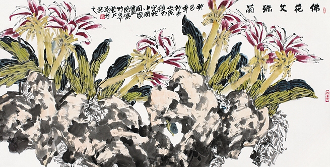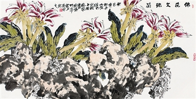 左图分别为本次拍品《山水》(陈如东作,大图)和《佛花文殊兰》(裘辑木作)