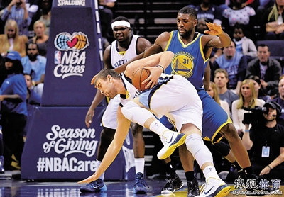 图为灰熊队中锋小加索尔(前)强行突破。小新发