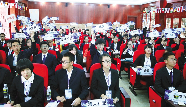 这是今天在海南中学开幕的第一届全国中学生模拟联合国大会“博鳌亚洲论坛”的会议现场。当天开始,来自全国28个省、自治区、直辖市的46所中学368名中学生,将分别扮演“政府代表”、“国际组织代表”、“企业代表”,召开为期两天半的“联合国妇女地位委员会”、“联合国气候变化框架公约缔约方大会”、“联合国经济与社会理事会”、“联合国安全理事会”、“世界卫生组织”、“博鳌亚洲论坛”6个“国际性会议”。另外,有19名大中学生担任6个会场的“主席团成员”,还有4名学生担任“主新闻中心记者”。