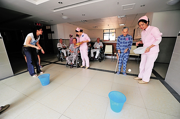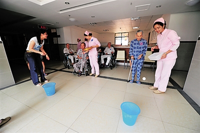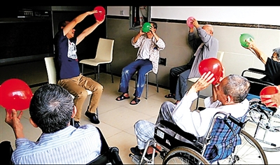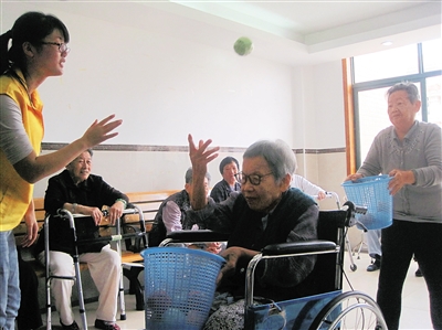 当天上午,省托老院二楼,一群老人围坐成一圈,在韦亚乔、文学等社工的帮助下正在做“趣味投球”的游戏。一个老人拿球,一个老人拿筐,拿球的老人要背对着拿筐的老人,将球投在筐里。虽然是个小游戏,但对平均年龄超过85岁且腿脚不便的老人来说,难度还是很大的。