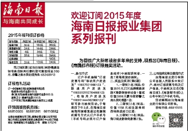 为回馈广大新老读者多年来的支持,现推出《海南日报》、《南国都市报》订报抽奖活动。