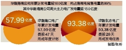 华能海南公司总经理孙德强说,公司在机组陆续进行环保改造的情况下,精心策划,积极行动,提前33天完成年度发电量156亿度目标,预计全年发电量超过170亿度,同比增长6.64%,创年度发电量历史新高,有效助力海南绿色崛起。截至12月1日,华能海南公司各电厂发电机组生产运行稳定,年累计利用小时达到7050小时,除检修时间外所有火电机组全天候满负荷运行;海口电厂实现跨年度安全生产3000天,电厂年度累计完成电量57.99亿度,提前47天完成了年度计划电量;东方电厂实现跨年度安全生产1850天,电厂年度累计完成电量93.38亿度,提前26天完成了全年发电任务。