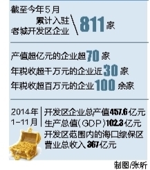 产业集群初具规模。老城开发区是我省唯一有较齐全产业体系的开发区,区内投资和产值达亿元以上的企业有中电集团、海南生态软件园、中航特玻、中石油、中海油、中石化、中国华能、中国国家电网、南方电网等70多家。截至今年5月,累计入驻开发区企业811家,产值超亿元的企业超70家,年税收超千万元的企业近30家,年税收超百万元的企业100余家。老城经济开发区2014年1-11月企业总产值457.6亿元,生产总值(GDP)102.3亿元,另外开发区范围内的海口综保区2014年1-11月营业总收入367亿元。