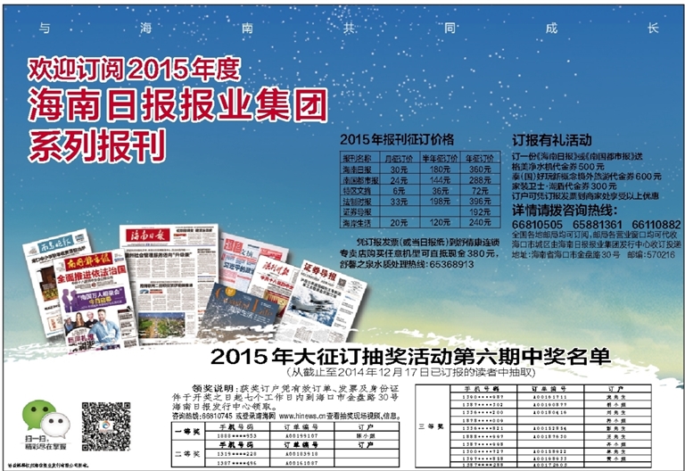 订一份《海南日报》或《南国都市报》送格美净水机代金券500元泰(国)好玩新概念境外旅游代金券600元 家装卫士·潮盾代金券300元 订户可凭订报发票到商家处享受以上优惠