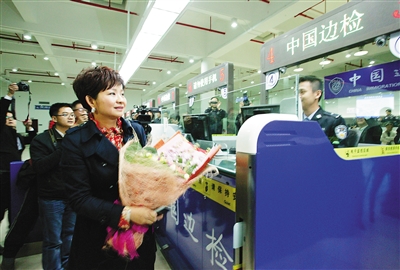 自12月18日零时起,澳门通往内地的三个口岸实施新通关安排。横琴-莲花口岸实施24小时通关。内地居民孙亮女士(前左)成为新通关安排实施后第一位从横琴-莲花口岸出境的旅客。 新华社记者 魏蒙 摄