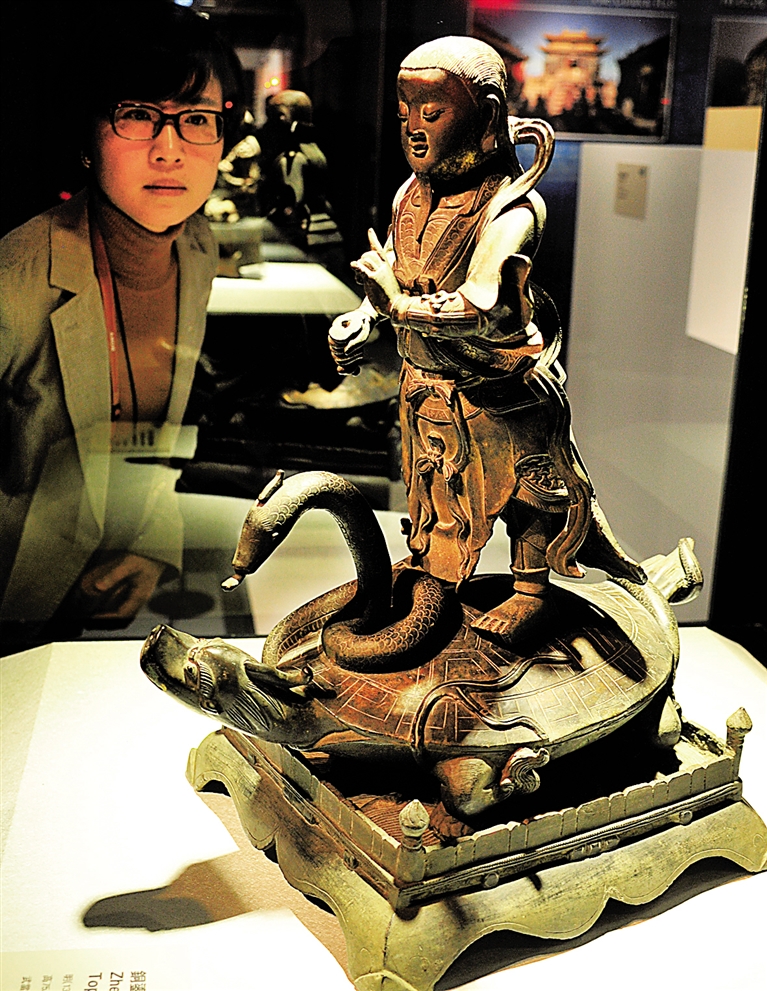 12月18日,市民在参观湖北省博物馆馆藏明朝“铜鎏金真武履玄武立像”。 当日,“神游武当——道教千年文物特展”在台北历史博物馆举行开幕仪式。 新华社发