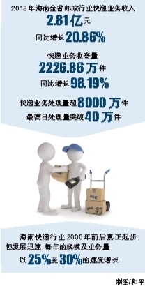 随后,记者又从海南省邮政管理局获悉,2013年海南全省邮政行业业务收入完成10.52亿元(不包括邮政储蓄银行直接营业收入),同比增长21.51%;业务总量完成8.87亿元,同比增长13.93%。值得注意的是,快递业务收入完成2.81亿元,同比增长20.86%;快递业务收寄量完成2226.86万件,同比增长98.19%,快递业务处理量超过8000万件,最高日处理量突破40万件。