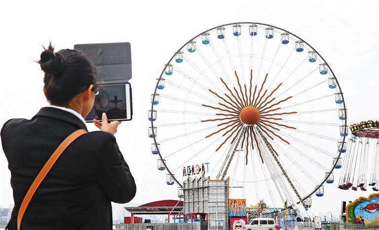 图为在海口世纪公园音乐广场,刚安装好的高44米的摩天轮吸引市民拍照留念。本报记者 张茂 摄