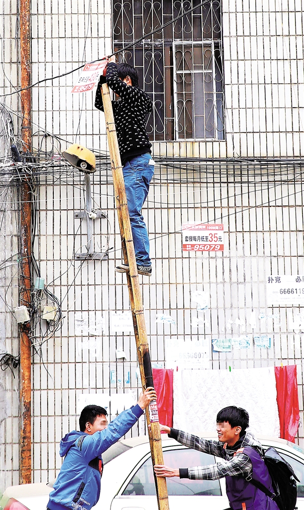 为了让执法人员不便清除,这三名小伙子沿路架梯在路灯电杆、电线、屋顶等高处悬挂非法商业小广告。随着执法人员在市区主干道清除非法小广告力度不断加大,这些商业小广告又向城中村转移,到处乱张贴、乱悬挂,严重影响市容环境。