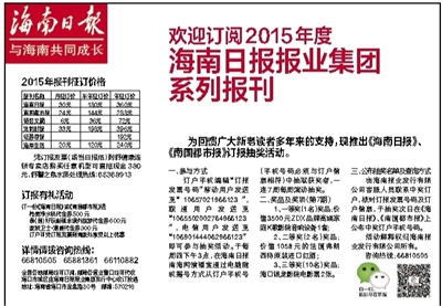 全国各地邮局均可订阅,邮局各营业窗口均可代收海口市城区由海南日报报业集团发行中心收订投递地址:海南省海口市金盘路30号 邮编:570216